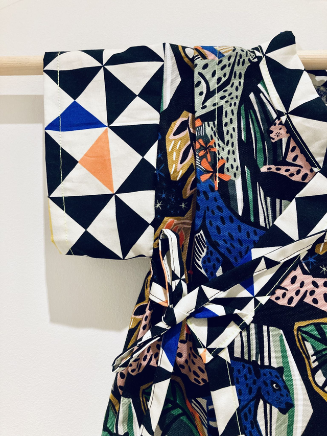 Children’s kimono style romper made from deadstock fabrics. Oversized fit and tie fastenings (at sides) for longevity.